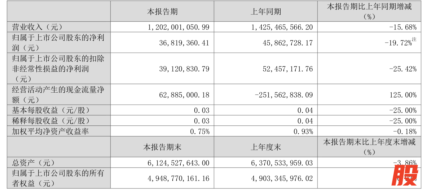 中证智能财讯东岳硅材(300821)4月26日披露2025年第一季度报告。公司实现营业总收入12.02亿元,同比下降15.68%;归母净利润3681.94万元,同比下降19.72%;扣非净利润3912.08万元,同比下降25.42%;经营活动产生的现金流量净额为6288.5万元,上年同期为-2.52亿元;报告期内,东岳硅材基本每股收益为0.03元,加权平均净资产收益率为0.75%。